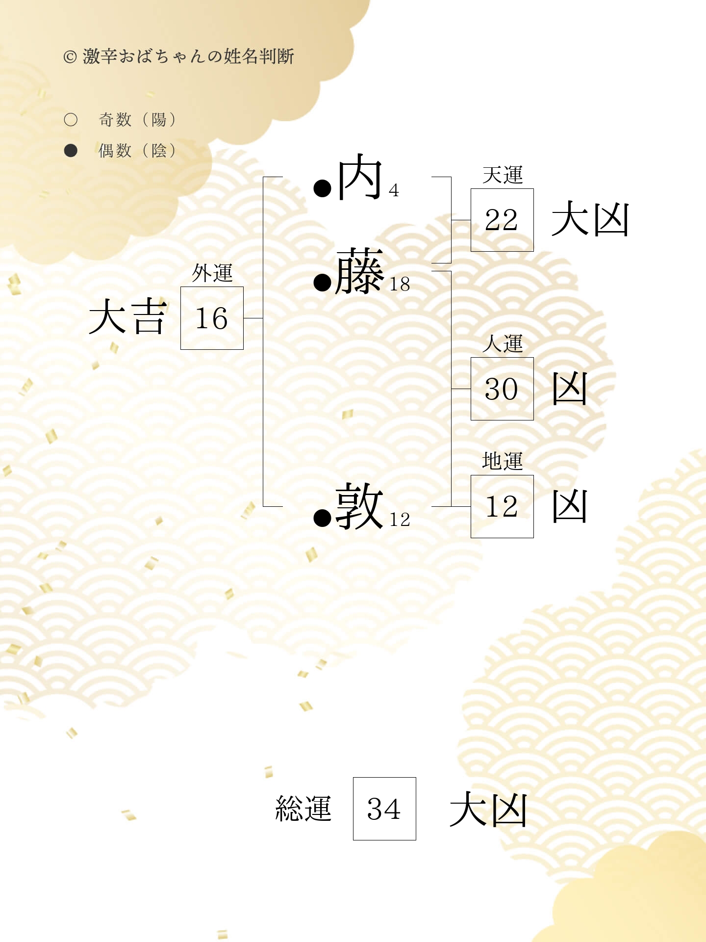 天運は名字だけで決まる運勢だから、姓名判断的にはぶっちゃけどうでもいい。その人というよりは、その人の家系に特有の運、というよりは宿命みたいなもんさな。天運が悪くてもあまり気にすることないよ!