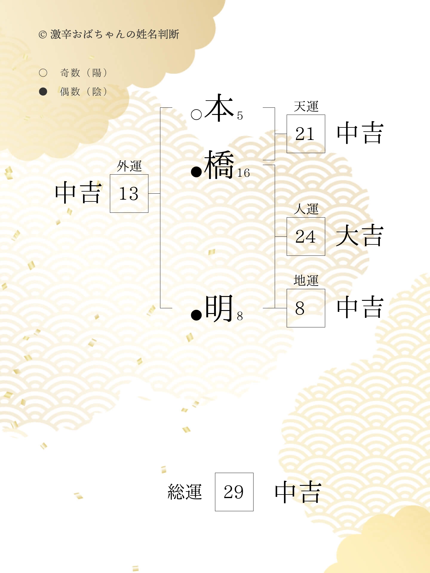 13というのはバランスがいい陽の数やから、姓名判断では大吉と考えられる。大吉と超大吉の間くらいかね。本当にすばらしい画数だから自分に自信を持ちなさいよ! 自信を持ちすぎるとダメだけどねえ。