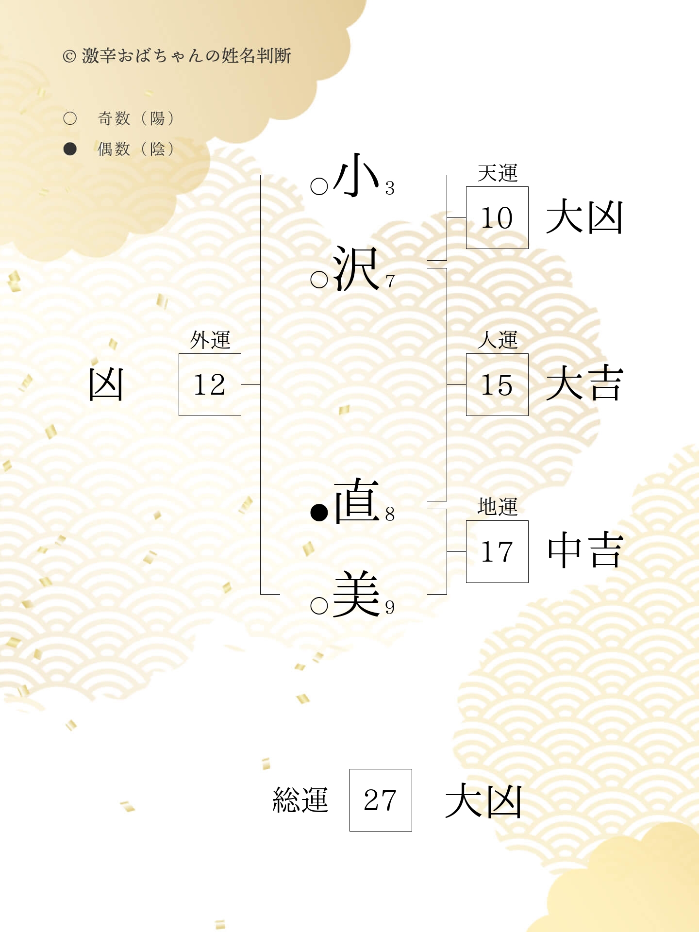 天運は名字だけで決まる運勢だから、姓名判断的にはぶっちゃけどうでもいい。その人というよりは、その人の家系に特有の運、というよりは宿命みたいなもんさな。天運が悪くてもあまり気にすることないよ!
